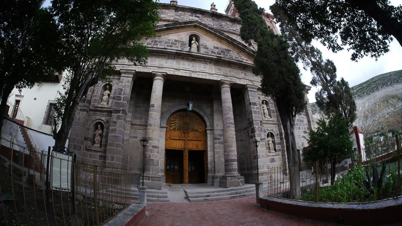 Desde cualquier ángulo, cerro, o planicie, la conformación de la iglesia roba vista al pueblo, pero la mejor apreciación de conjunto se logra desde a media altura del cerro del orégano, logrando apreciar también, conforme se asciende, parcialidades del pueblo; el gran tamaño de la nave en conjunto con la casa del peregrino, la alhóndiga y la casa de moneda, forman un corredor de grandes edificaciones por la calle de Lanzagorta, que inicia desde la alhóndiga y termina hasta poco antes de la plaza Hidalgo.